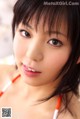 A woman in a pink and white striped bikini posing for the camera.