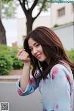 A woman with long black hair wearing a white jacket.