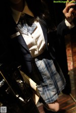 A woman in stockings and a skirt is sitting on a couch.