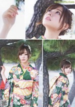 A woman in a kimono leaning against a wall.