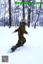 A woman in a blue and white bikini posing for a picture.